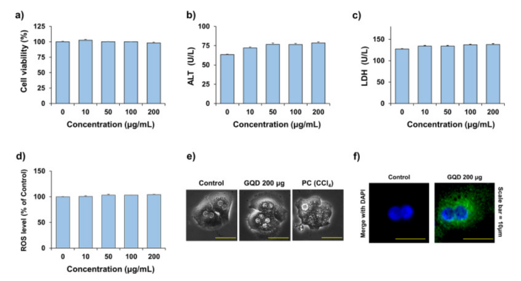 Figure 5. 用不同濃度的t-GQDs(10、50、100和200 ug/mL)處理小鼠肝細(xì)胞48小時(shí),以檢測(cè)(a)細(xì)胞活力、細(xì)胞外水平(b) ALT,(c)肝細(xì)胞LDH釋放水平和(d) DCF-DA刺激后ROS水平。e)光鏡下觀察未處理肝細(xì)胞和200 ug t-GQDs和CCl