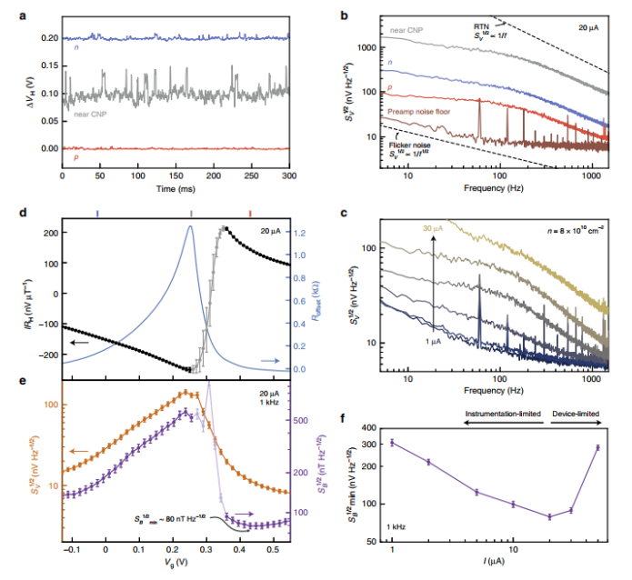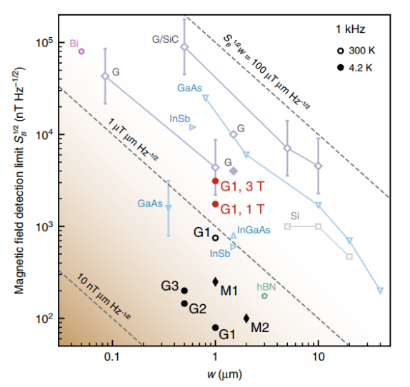 固態(tài)磁場(chǎng)傳感器對(duì)于商業(yè)電子領(lǐng)域和基礎(chǔ)材料研究應(yīng)用是很重要的。大多數(shù)磁場(chǎng)傳感器是在有限的溫度和磁場(chǎng)范圍內(nèi)工作,而霍爾傳感器原則上可以在很寬的溫度、磁場(chǎng)范圍內(nèi)工作。在這里,將超凈石墨烯作為一種材料平臺(tái)用于高性能霍爾傳感器,即將石墨烯封裝在六方氮化硼和幾層石墨中,制造了微米級(jí)器件。在不同條件下還優(yōu)化了磁場(chǎng)檢出限。對(duì)于1μm的設(shè)備,在1 kHz頻率下,室溫時(shí)極限達(dá)700 nT Hz