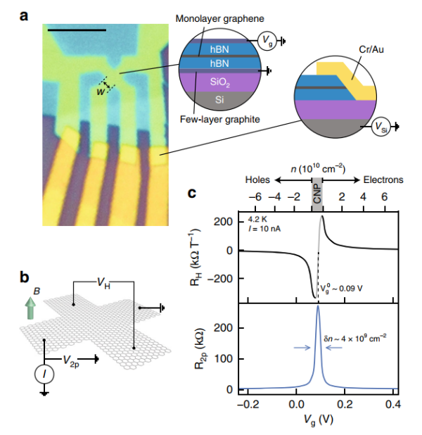 Figure 2. 超凈石墨烯霍爾傳感器。(a)裝置G1的光學(xué)照片,(b)測(cè)量裝置的示意圖,(c)霍爾系數(shù)RH的頂柵電壓(Vg)和和兩點(diǎn)電阻R2p的依賴性,條件:在4.2 K下,小交流偏壓,背景場(chǎng)B=100 mT。