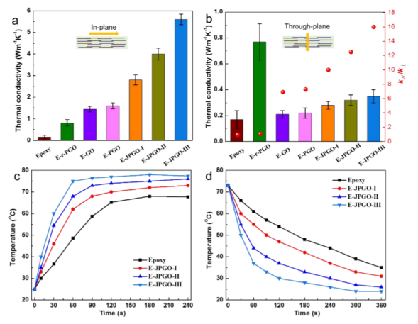 Figure 7. 環(huán)氧樹脂、E-r-PGO、E-PGO和E-JPGO納米復合材料的(a)平面上及(b)平面內(nèi)導熱性和導熱各向異性。(c和d) E-JPGO納米復合材料的溫度。