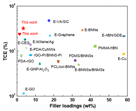 Figure 8. E-JPGO納米復合材料與已有報道的聚合物復合材料TCE的比較。