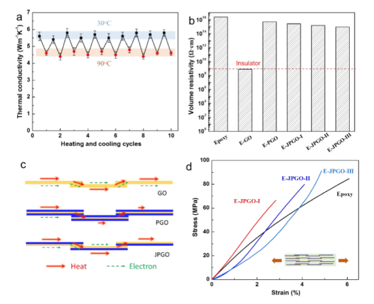 Figure 9. (a) E-JPGO-III的熱循環(huán)穩(wěn)定性。(b)環(huán)氧樹脂,E-GO,E-PGO和E-JPGO納米復合材料的電阻率。(c) E-JPGO納米復合材料的導熱但電絕緣機理示意圖。(d)環(huán)氧樹脂和E-JPGO納米復合材料的應(yīng)力-應(yīng)變曲線。
