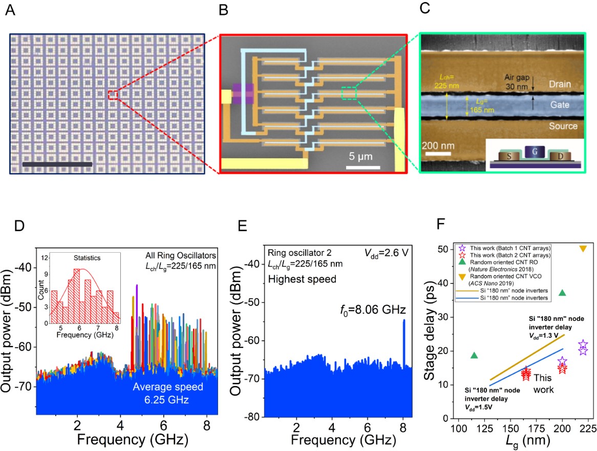 北京大學(xué)信息科學(xué)技術(shù)學(xué)院電子學(xué)系/北京大學(xué)碳基電子學(xué)研究中心、納米器件物理與化學(xué)教育部重點(diǎn)實(shí)驗(yàn)室張志勇教授-彭練矛教授課題組發(fā)展全新的提純和自組裝方法,制備高密度高純半導(dǎo)體陣列碳納米管材料,并在此基礎(chǔ)上首次實(shí)現(xiàn)了性能超越同等柵長硅基CMOS技術(shù)的晶體管和電路,展現(xiàn)出碳管電子學(xué)的優(yōu)勢。該課題組采用多次聚合物分散和提純技術(shù)得到超高純度碳管溶液,并結(jié)合維度限制自排列法,在4英寸基底上制備出密度為120/μm、半導(dǎo)體純度高達(dá)99.99995%、直徑分布在1.45±0.23 nm的碳管陣列(見圖2),從而達(dá)到超大規(guī)模碳管集成電路的需求?;谶@種材料,批量制備出場效應(yīng)晶體管和環(huán)形振蕩器電路,100nm柵長碳管晶體管的峰值跨導(dǎo)和飽和電流分別達(dá)到0.9 mS/μm和1.3 mA/μm(VDD=1V,見圖3),室溫下亞閾值擺幅為90 mV/DEC;批量制備出五階環(huán)形振蕩器電路,成品率超過50%,最高振蕩頻率8.06 GHz遠(yuǎn)超已發(fā)表的基于納米材料的電路(見圖4),且超越相似尺寸的硅基CMOS器件和電路。