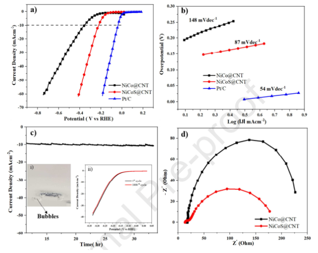 Figure 5. NiCo@CNT,NiCoS@CNT和商用Pt/C(20%)在1 M KOH溶液中5 mV s-1掃速下的a)LSV極化曲線,b)Tafel斜率,c)時(shí)間-電流密度曲線,在0.26 V恒定電勢(shì)下持續(xù)38 hr電解,插圖(i)顯示了電解時(shí)電極表面產(chǎn)生了H2氣泡,插圖(ii)呈現(xiàn)了循環(huán)1000圈CV前后的LSV極化曲線比較, d)兩個(gè)樣品的EIS譜比較。