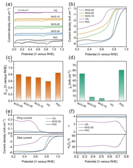 Figure 3. (a)在N2飽和(虛線)和O2飽和(實(shí)線)的0.1 M KOH溶液中的CV曲線,掃描速率為50 mV s-1。(b)LSV曲線比較,轉(zhuǎn)速為1600 rpm,掃速為10mV s-1。(c)0.75 V時(shí)的半波電位和(d)動(dòng)力學(xué)電流密度。(e)環(huán)電流和盤(pán)電流。(f)H2O2產(chǎn)率和電子轉(zhuǎn)移數(shù)。