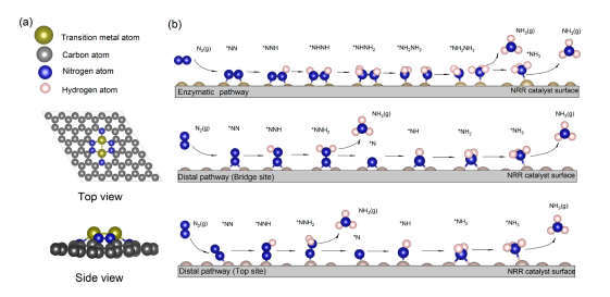 Figure 1. 原子對催化劑(APC)原子模型以及氮還原反應(yīng)的酶促途徑和遠端途徑(橋位和頂位)。