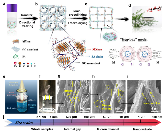 Figure 1. 基于3D宏觀氧化石墨烯/MXene氣凝膠(GMA)的太陽能界面蒸發(fā)器。