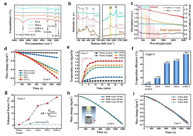 x(MXene)巧妙地組裝成3D多孔宏觀氣凝膠整體,作為獨(dú)立的太陽能驅(qū)動(dòng)界面蒸發(fā)器,以實(shí)現(xiàn)高效、全面的水凈化。在此過程中,MXene將GO還原為還原氧化石墨烯(RGO),從而實(shí)現(xiàn)了自增強(qiáng)的光熱轉(zhuǎn)化調(diào)節(jié)?;诟?dòng)GO/MXene氣凝膠(GMA)的蒸發(fā)器在一次陽光照射下實(shí)現(xiàn)了高達(dá)90.7%的高太陽蒸發(fā)效率,蒸發(fā)速率為1.27 kg/m
