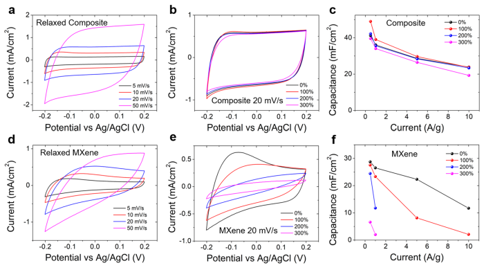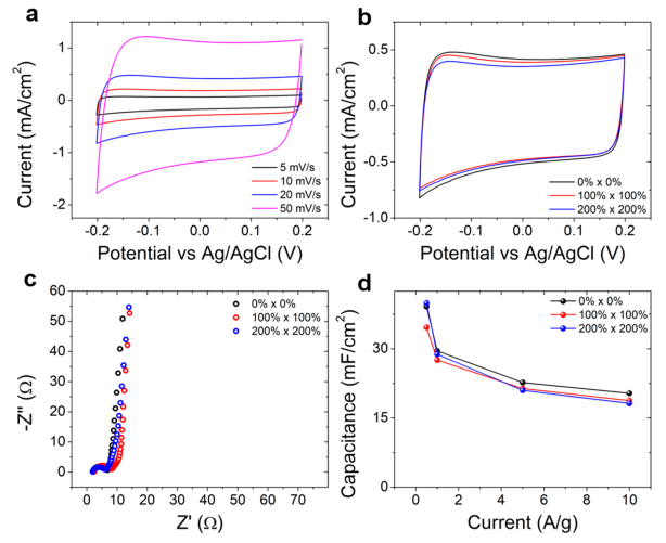 x/RGO復合電極減輕了在大應變下產(chǎn)生的裂紋。復合電極在承受單軸(300%)或雙軸(200%×200%)循環(huán)應變時表現(xiàn)出49 mF/cm