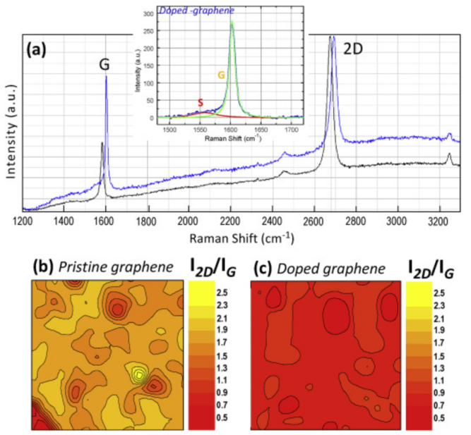 Fig. 4. 單層石墨烯摻雜前后的拉曼特性研究。