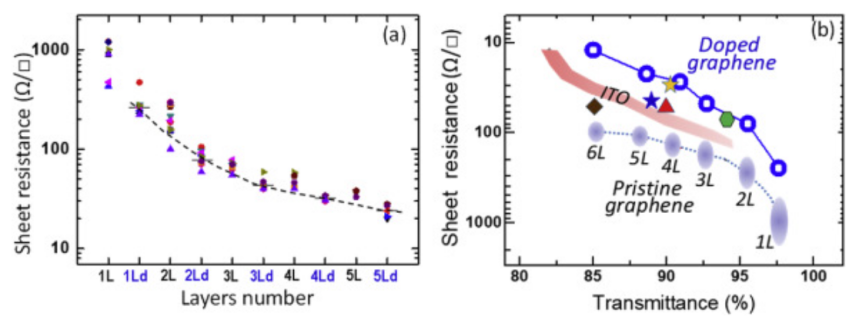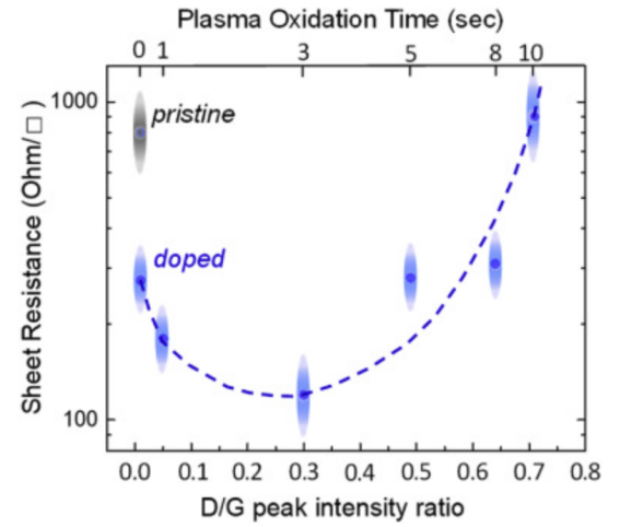 化學的熱(T ≥ 120°C)和吡啶催化活化還導致石墨烯基面上產(chǎn)生更多的p摻雜官能團。對于六層堆疊的石墨烯薄膜,在550 nm處的光透射率為85%時,可獲得18Ω/□的薄層電阻值。此外,等離子體可控氧化石墨烯可以在石墨烯基面引入適量的環(huán)氧和羥基缺陷,最大限度地實現(xiàn)摻雜劑功能化,從而最大化提高載流子密度,同時又不顯著影響載流子的遷移率。對于具有97.5%光學透明性的單層石墨烯,此方法可使其最小薄層電阻值達到120Ω/□。