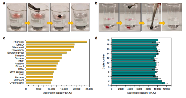 Figure 3. COF/rGO氣凝膠的吸附性能。從水中吸附染色的硅油a)和氯仿b)。c)吸附效率和d)循環(huán)穩(wěn)定性。基于三個獨立測量,誤差線顯示了標(biāo)準(zhǔn)偏差。二甲基亞砜,二甲基甲酰胺,二甲基乙酰胺和四氫呋喃分別縮寫為DMSO,DMF,DMA和THF。