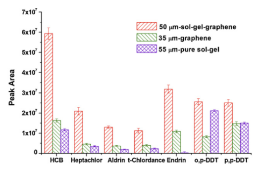 Figure 2. 溶膠-凝膠-石墨烯涂層纖維,純溶膠-凝膠涂層纖維和純石墨烯涂層纖維的萃取性能比較。