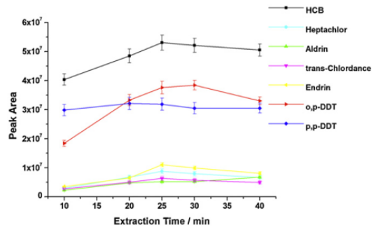 Figure 5.解吸溫度對OCPs萃取效率的影響。萃取時間25分鐘,其他萃取條件與Fig.3相同。