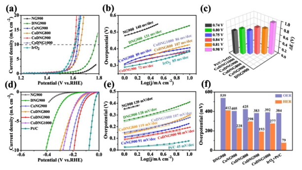 Figure 4. OER性質(zhì)和HER性質(zhì)。(a)所有催化劑在O2飽和的0.1 M KOH溶液中的LSV曲線,以及(b)相應(yīng)的Tafel圖,(c)所有催化劑的△E,(d)所有催化劑于Ar飽和的0.1 M KOH溶液中的LSV曲線以及相應(yīng)的(e)Tafel圖,(f)催化劑在10 mA/cm2電流密度時(shí)的OER和HER過電位比較。