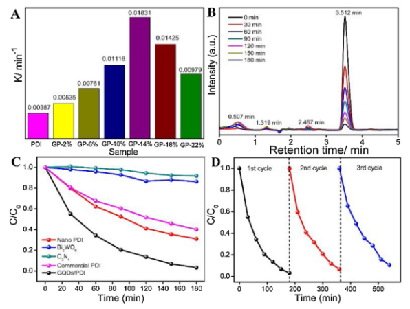 Figure 1.(A)可見光下光催化苯酚降解時(shí)的表觀速率常數(shù),(B)GQDs/PDI-14%存在時(shí)苯酚的HPLC譜圖。