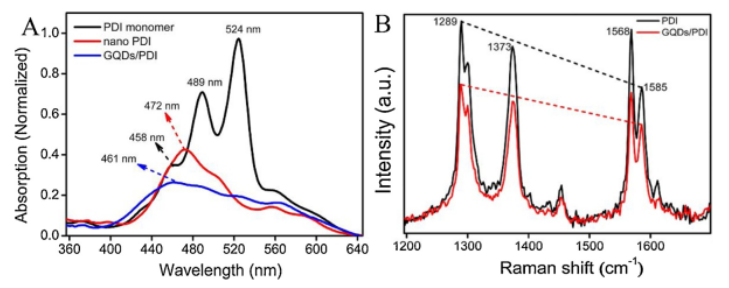 Figure 3. (A) PDI單體在DMF溶液,納米PDI和GQDs/PDI懸浮液在水中(pH=2)的紫外-可見吸收光譜,(B)PDI和GQDs/PDI-14%的拉曼光譜。