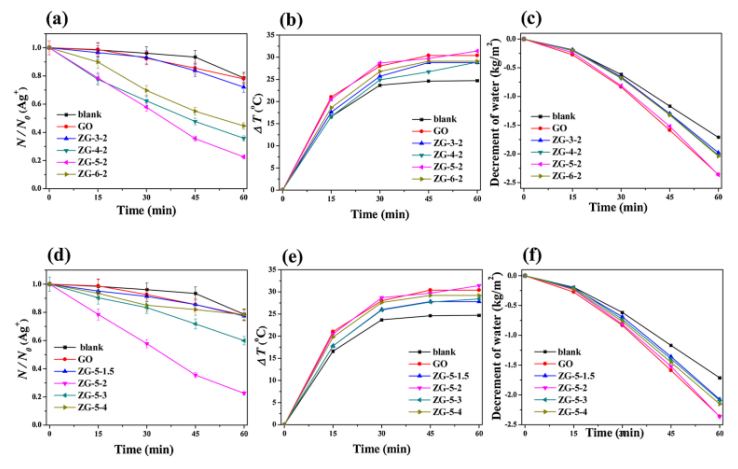 Figure 6. ZG-X-2膜含不同Co(NO3)2·6H2O濃度時,其相應(yīng)的(a)Ag+光還原過程,(b)溫度演變,(c)水重量衰減曲線,ZG-5-Y膜含2-MIM/Co(NO3)2·6H2O不同摩爾比時,相應(yīng)的(d)Ag+光還原過程,(e)溫度演變,(f)水重量衰減曲線。