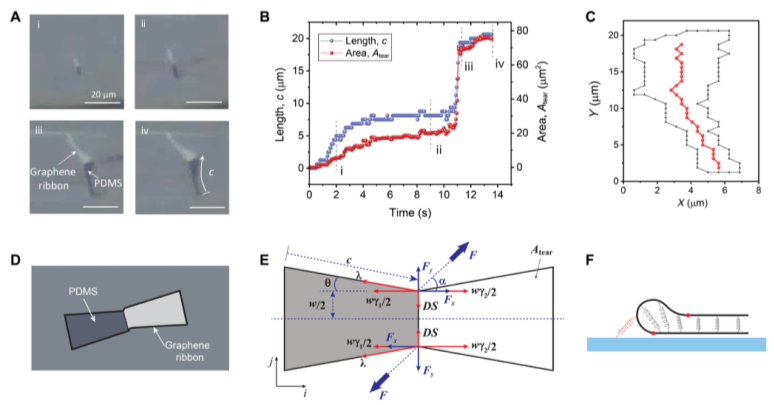 石墨烯通常通過弱范德華(vdW)相互作用與其他材料接觸。特別令人感興趣的是石墨烯-聚合物界面,該界面在包括柔性電子產(chǎn)品和多功能涂料在內(nèi)的各種應(yīng)用中不斷受到動(dòng)態(tài)負(fù)載的影響。通過原位循環(huán)載荷,我們直接觀察到了石墨烯-聚合物界面的界面疲勞擴(kuò)展,發(fā)現(xiàn)該界面滿足修正的Paris定律。此外,通過結(jié)合平面內(nèi)剪切和平面外撕裂機(jī)制,通過vdW接觸產(chǎn)生的周期性載荷甚至能夠?qū)е略际┑钠跀嗔?。剪切斷裂主要發(fā)生在循環(huán)載荷引起的褶皺連接處,并平行于載荷方向傳播。進(jìn)行斷裂力學(xué)分析,發(fā)現(xiàn)了循環(huán)加載過程中石墨烯異乎尋常的自撕裂行為動(dòng)力學(xué)。這項(xiàng)工作為石墨烯和石墨烯-聚合物界面的動(dòng)態(tài)可靠性提供了機(jī)械上的見解,這將有助于石墨烯基結(jié)構(gòu)的持久設(shè)計(jì)。