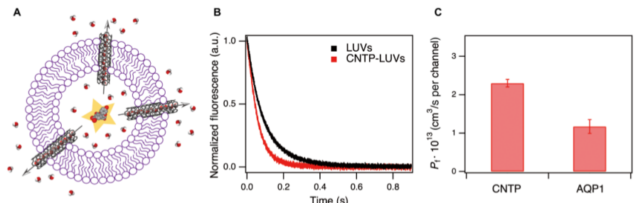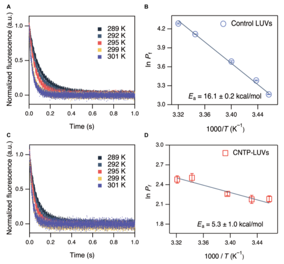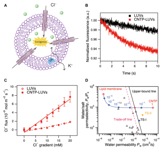 碳納米管(CNT)孔模仿水通道的結(jié)構(gòu),可支持極高的水傳輸速率,使其成為構(gòu)建人造水通道和高性能膜的有力候選者。在優(yōu)化的實(shí)驗(yàn)條件下,我們測量了直徑為0.8 nm的CNT孔蛋白(CNTP)(嵌入脂質(zhì)膜中的短CNT片段)來測量水和離子的滲透率。通過CNTPs測得的水傳輸活化能與典型的單排水傳輸阻隔值一致。在CNTPs中,對(duì)水傳輸進(jìn)行適當(dāng)?shù)脑獎(jiǎng)恿W(xué)模擬也報(bào)告了相似的活化能值,并提供了水進(jìn)入這些通道的分子尺度機(jī)制的細(xì)節(jié)。CNTPs強(qiáng)烈排斥氯離子,并顯示出與商業(yè)脫鹽膜相當(dāng)?shù)乃}滲透選擇性值。