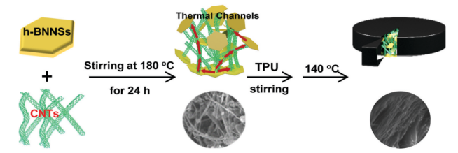 Figure 1. h-BNNSs/CNTs/TPU復(fù)合膜的合成過(guò)程示意圖。