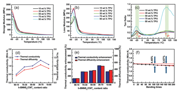 Figure 4. (a–c)具有不同TPU含量的h-BNNSs/CNT/TPU復(fù)合材料的DMA結(jié)果;(d)(h-BNNSX/CNT Y)65/TPU35復(fù)合膜的熱導(dǎo)率和熱擴(kuò)散率;(e)熱導(dǎo)率增強(qiáng)和熱擴(kuò)散率;(f)循環(huán)彎曲后,(h-BNNS30/CNT70)65/TPU35復(fù)合材料的熱導(dǎo)率。