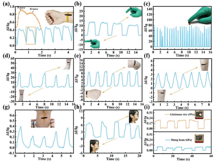 -1),寬線性范圍(0–10 kPa),低檢測(cè)極限(6 Pa),響應(yīng)時(shí)間短(232毫秒),耐久性好(6000次循環(huán))。此外,該設(shè)備能夠?qū)崟r(shí)監(jiān)控各種人類活動(dòng),并區(qū)分出細(xì)微的谷物差異。還探討了繪制壓力的位置和強(qiáng)度的潛在應(yīng)用。