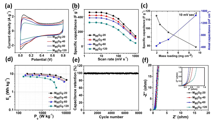 Figure 3. MXene-石墨烯雜化水凝膠在三電極結(jié)構(gòu)中的儲能性能