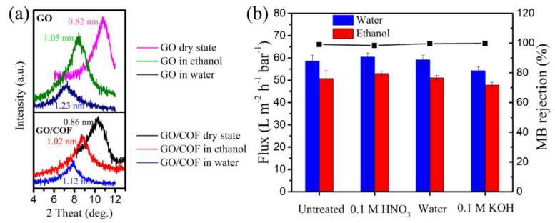 -1的甲醇和乙醇)滲透通量,在乙醇溶劑中的亞甲基藍(lán)(320 g/mol)和剛果紅(697 g/mol)的有機(jī)染料排斥率分別為99%和99.82%。此外,插入COF可以大大減少GO基質(zhì)的溶脹,從而在暴露于水以及強(qiáng)酸/強(qiáng)堿溶液時(shí)增強(qiáng)膜的穩(wěn)定性,從而在長(zhǎng)期(48 h)操作中實(shí)現(xiàn)較高的過(guò)濾性能。