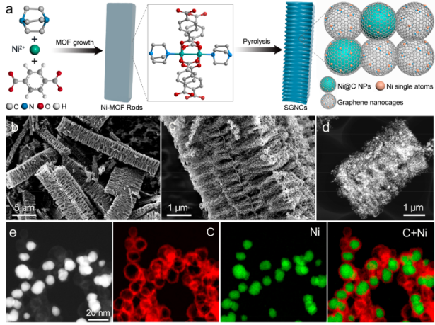 Figure 1.(a)SGNC雜化物的制備過程示意圖。 (b,c)具有不同放大率的FESEM圖像。(d)典型HAADF-STEM圖像。(e)HAADF-STEM圖像和C(紅色)和Ni(綠色)的相應(yīng)EDX元素圖。