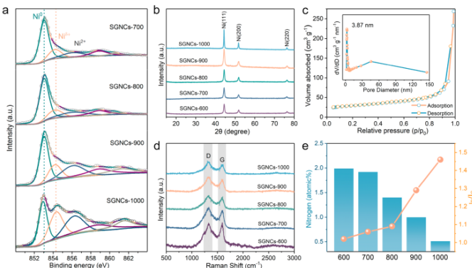 Figure 3. (a,b)SGNC樣品的高分辨率Ni 2p XPS光譜和XRD圖。(c)N2吸附-解吸等溫線和SGNCs-900的孔徑分布曲線。(d,e)不同SGNC樣品的拉曼光譜以及N含量和I