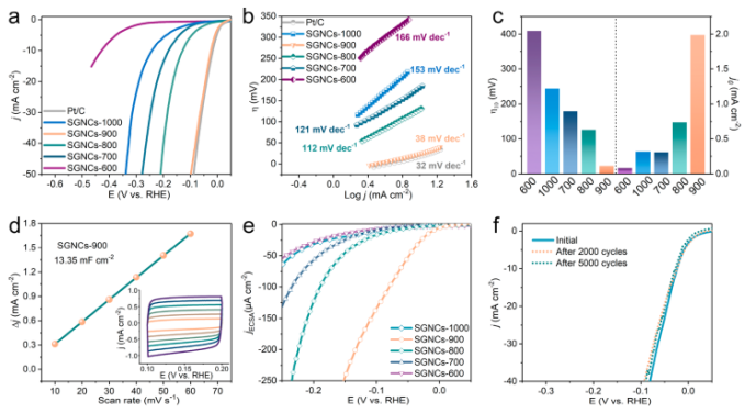 Figure 4. (a)各種SGNC和Pt / C在1.0 M KOH中的極化曲線。(b)從極化曲線中獲得的Tafel圖。(c)10 mA cm-2處的過電勢(左)和交換電流密度(右)。(d)SGNCs-900的C