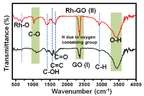 Figure 3. (I)GO和(II)Rh-GO納米復合材料的疊加FT-IR光譜,確認酸功能化,隨后 Rh NSs修飾過程。