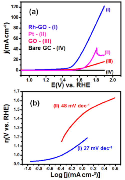 Figure 6. (a)Rh-GO,商用鉑絲,功能化GO和空白GC在0.5 M KOH中的OER極化曲線(LSV)。(b)不同催化劑材料的OER Tafel圖比較。