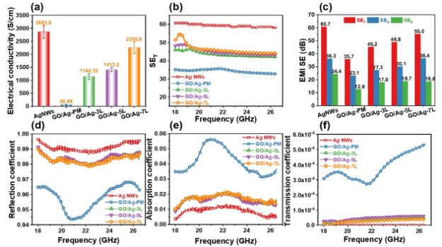 在軍事和民用領(lǐng)域,探索超寬頻電磁屏蔽材料,以消除來自電子設(shè)備的各種頻率電磁干擾,仍是一項巨大的的挑戰(zhàn)。這里,通過真空輔助自組裝,構(gòu)造了獨立式氧化石墨烯/銀納米線(GO/Ag-7L)膜,其具有密集的三明治狀結(jié)構(gòu)。與機械混合膜的隨機分布相比,多層GO/Ag-7L膜中,銀納米線被編織成3D導(dǎo)電網(wǎng)絡(luò)結(jié)構(gòu),具有出色的導(dǎo)電性(2255.8S/cm)。受益于GO的多層結(jié)構(gòu)具有多次吸收,以及銀納米線網(wǎng)絡(luò)的多次反射,在8-40 GHz的超寬頻范圍(覆蓋X波段,Ku波段,K波段,和Ka波段),其干擾屏蔽效率(EMI SE)高達62 dB(厚度僅為8微米)。相應(yīng)的比SE(EMI SE/t)高達77500 dB/cm。插入GO層后,GO/Ag-7L膜表現(xiàn)出出色的柔韌性和防腐蝕性能??紤]到實際應(yīng)用,可以將其用作新穎的應(yīng)變傳感器,具有高靈敏度和快速應(yīng)變響應(yīng),應(yīng)用于機器人,既滿足電磁干擾保護要求又滿足實時運動監(jiān)控。因此,它在精密的電子設(shè)備中具有廣闊的應(yīng)用前景。