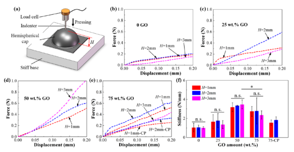 Figure 3. 在中心使用壓力點(diǎn)對壓印的半球形帽進(jìn)行剛度測試:(a)實(shí)驗(yàn)裝置示意圖,(b-e)不同GO含量時(shí)的力-位移曲線;(f)不同GO含量時(shí)的硬度和樣品高度H。