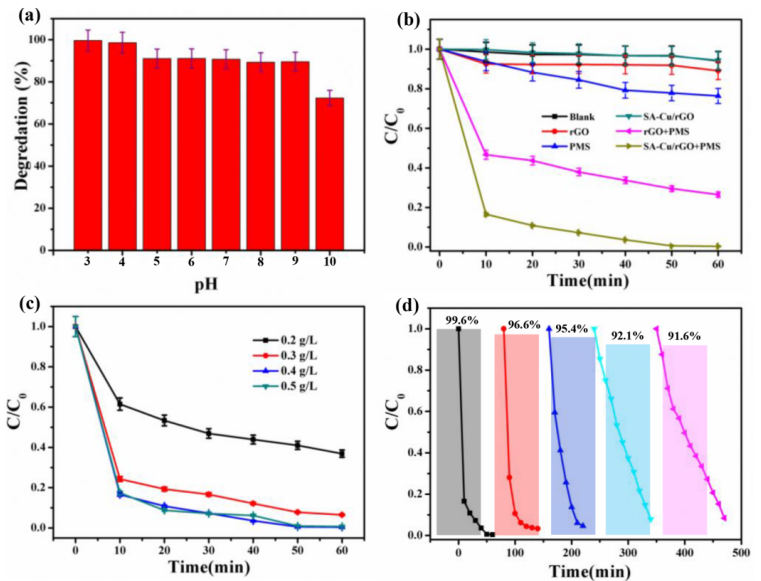 Figure 2. (a)初始溶液pH值的影響;(b)不同的反應(yīng)系統(tǒng)和(c)PMS劑量對SMX降解的影響。(d)回收的SA-Cu/rGO使SMX循環(huán)降解。