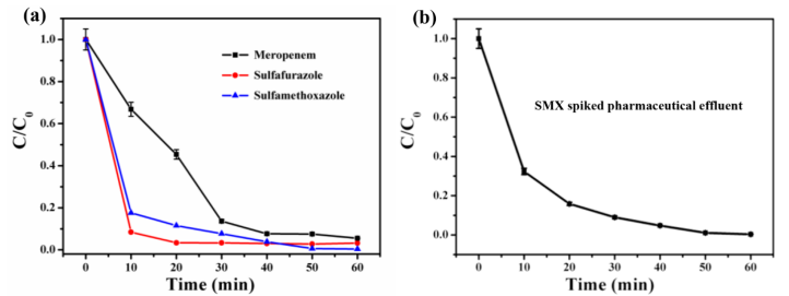 Figure 3. (a)通過使用SA-Cu/rGO/PMS系統(tǒng)催化降解各種抗生素和(b)降解SMX加標制藥廢水