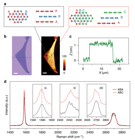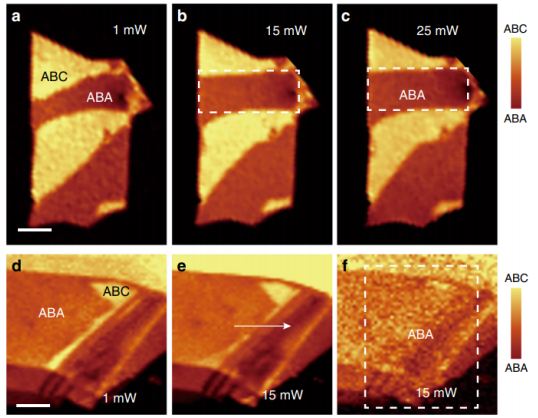 晶體結(jié)構(gòu)對(duì)相應(yīng)材料的物理性質(zhì)有深刻的影響。通過(guò)合成具有特定對(duì)稱性的晶體,即使對(duì)于相同的化學(xué)構(gòu)型(例如,石墨和金剛石),也可以強(qiáng)烈地調(diào)節(jié)其性能。當(dāng)可以通過(guò)外部刺激動(dòng)態(tài)改變晶體的結(jié)構(gòu)相時(shí),就會(huì)出現(xiàn)更多有趣的機(jī)會(huì)。這種能力雖然很少見(jiàn),但會(huì)導(dǎo)致許多令人興奮的現(xiàn)象,例如相變記憶效應(yīng)。在三層石墨烯的情況下,有兩種常見(jiàn)的堆疊構(gòu)型(ABA和ABC),它們具有不同的電子帶結(jié)構(gòu),表現(xiàn)出非常不同的行為。疇壁以兩個(gè)堆積順序存在于三層石墨烯中,顯示出令人著迷的新物理學(xué),例如量子谷霍爾效應(yīng)。三層石墨烯的相變工程已經(jīng)得到了廣泛的研究。然而,操縱疇壁以實(shí)現(xiàn)對(duì)局部結(jié)構(gòu)和性質(zhì)的精確控制仍然是相當(dāng)大的挑戰(zhàn)。在這里,實(shí)驗(yàn)證明,我們可以通過(guò)激光輻照從一個(gè)結(jié)構(gòu)相切換到另一個(gè)結(jié)構(gòu)相,從而在三層石墨烯中創(chuàng)建不同形狀的疇。通過(guò)控制疇壁的位置和方向,可以精細(xì)地控制石墨烯的局部結(jié)構(gòu)相和性質(zhì),為制造具有設(shè)計(jì)的原子結(jié)構(gòu)和電子光學(xué)性質(zhì)的人工二維材料提供了一種簡(jiǎn)單而有效的方法。