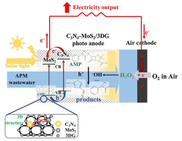 以三維(3D)光電極為光陽極,以Pt/C空氣呼吸電極為陰極,開發(fā)了增強的電子和質量光催化流通系統(tǒng)。比較了3D石墨烯光電極上負載C