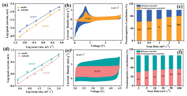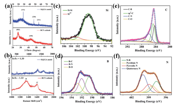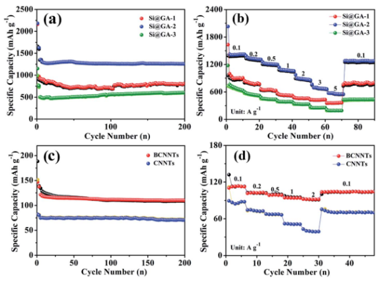 這里,設計了石墨烯氣凝膠(GA)支撐的高容量硅(Si)納米顆粒3D導電框架,將其作為LIC陽極,可克服Si體積膨脹的問題,同時提高了相應的能量密度。更重要的是,主要的電容機制在于Si@GA陽極的嵌入過程中,這使其具有快速的充放電能力。所以為了匹配高容量陽極,將具有高倍率特性電容行為和高容量的碳氮化硼納米管(BCNNT)作為陰極,構(gòu)建了具有高能量密度的新型LIC。得益于陽極和陰極的高倍率特性,所設計得4.5 V Si@GA//BCNNTs LIC表現(xiàn)出出色的電化學性能,可提供最大的功率密度225 W kg-1,此時能量密度為197.3 W h kg-1。該研究策略可能會解決一些材料得體積膨脹問題,從而更好應用于贗電容高倍率特性器件。