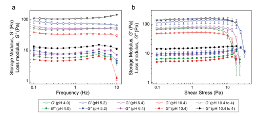 Figure 4. 不同pH值下TOCN/GO混合溶膠的流變特性。a)頻率掃描和b)剪切應(yīng)力掃描測(cè)試。