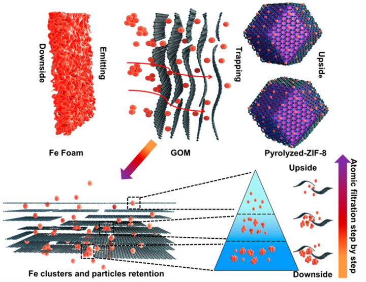 單原子催化劑(SACs)作為一種杰出的催化劑已經(jīng)引起了廣泛的關(guān)注,構(gòu)成了一系列吸引人的催化反應(yīng)性能。本文中,開發(fā)了一種簡單而巧妙的策略,用于在氧化石墨烯膜(GOMs)的輔助下,在固體擴(kuò)散過程中通過原子過濾來制造SACs。首先,在熱處理的驅(qū)動(dòng)下,F(xiàn)e物種(原子、團(tuán)簇或顆粒)通過GOM擴(kuò)散的Fe泡沫中散發(fā)出來。通過精心調(diào)制GOM的層數(shù)及其層間間距,GOM可以排除Fe物種的簇和顆粒。因此,可滲透的單個(gè)Fe原子被有缺陷的富N位點(diǎn)捕獲,從而生成了孤立的Fe位點(diǎn)催化劑(Fe SAs/N-C)。制備的SACs對(duì)氧還原反應(yīng)(ORR)表現(xiàn)出優(yōu)異的催化性能。此外,可以輕松擴(kuò)展此策略以準(zhǔn)備其他SACs,例如Co SAs/N-C和Ni SAs/N-C。