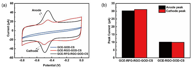 由于高表面積、豐富的官能團和良好的生物相容性,氧化石墨烯(GO)在葡萄糖檢測中受到了廣泛的關注。GO的缺陷和官能團有利于葡萄糖氧化酶(GOD)的固定化,但犧牲了電子傳遞能力以實現(xiàn)高度靈敏的檢測。為了獲得高GOD負載和對生物傳感器的高靈敏度檢測,我們首先通過將GO和邊緣功能化石墨烯(FG)層組合到玻璃碳電極上來設計和制造石墨烯薄片電極。與文獻報道的其他基于石墨烯的生物傳感器相比,石墨烯薄片電極具有更快的電子傳輸速率,更高的GOD負載3.80×10