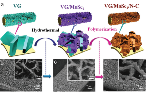 Figure 1.(a)合成三明治VG/MoSe2/N-C核殼陣列的示意圖。(b-d)對應過程的SEM圖。