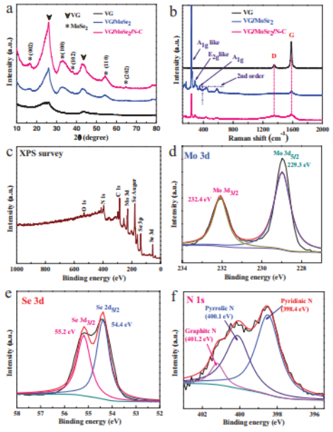 Figure 3. VG,VG/MoSe2和VG/MoSe2/N-C的a)XRD圖和b)拉曼光譜。 VG/MoSe2/N-C的XPS光譜:c)總譜,d)Mo 3d,e)Se 3d和f)N 1s光譜。
