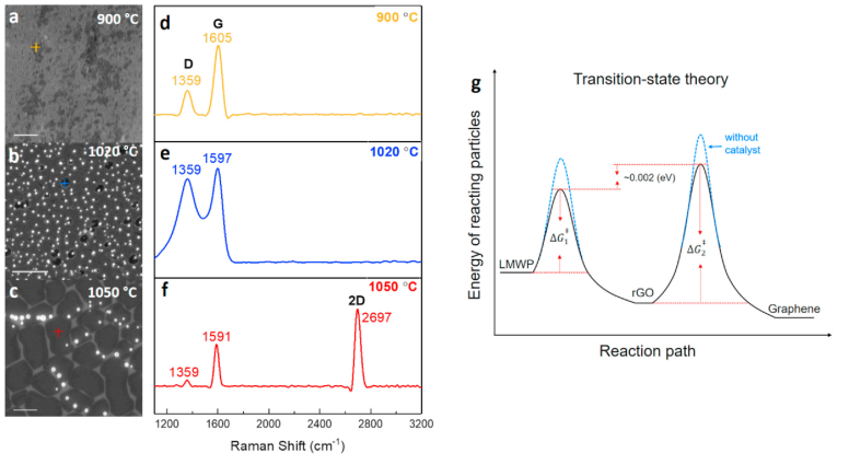 Figure 2. 不同溫度下,在銅箔上生長(zhǎng)的碳納米材料的(a-c)SEM圖像和(d-f)拉曼光譜。比例尺1毫米。(g)基于過渡態(tài)理論,從乙酸纖維素到rGO和石墨烯的反應(yīng)路徑說明。