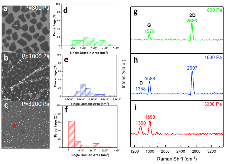 Figure 5. 在不同壓力下,在銅箔上生長(zhǎng)的石墨烯的(a-c)SEM圖像,(d-f)統(tǒng)計(jì)分析和(g-i)拉曼光譜。比例尺1毫米。