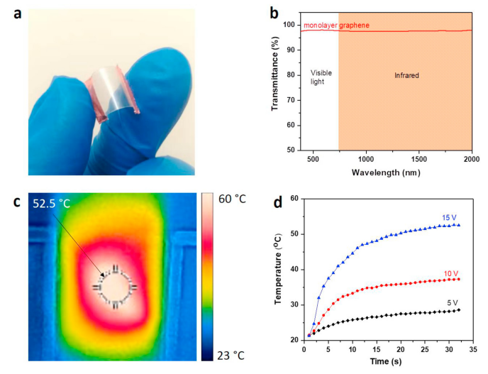 Figure 6. (a)石墨烯/PET柔性加熱器的光學(xué)圖像。(b)石英襯底上單層石墨烯的光譜。(c)在15 V的供電電壓下,捕獲的石墨烯/PET柔性加熱器的紅外圖像。(d)在不同的供電電壓下,石墨烯/PET柔性加熱器的溫度曲線。