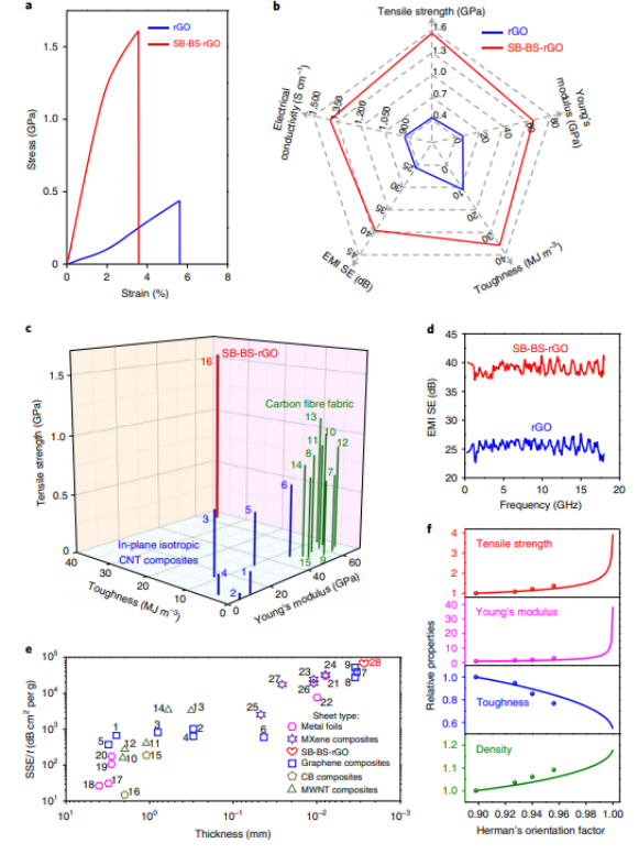 Fig. 5 通過DB鑄造制成的重疊和層壓SB-BS-rGO和SB-BS-rGO(DB)薄片的機械和電氣性能。